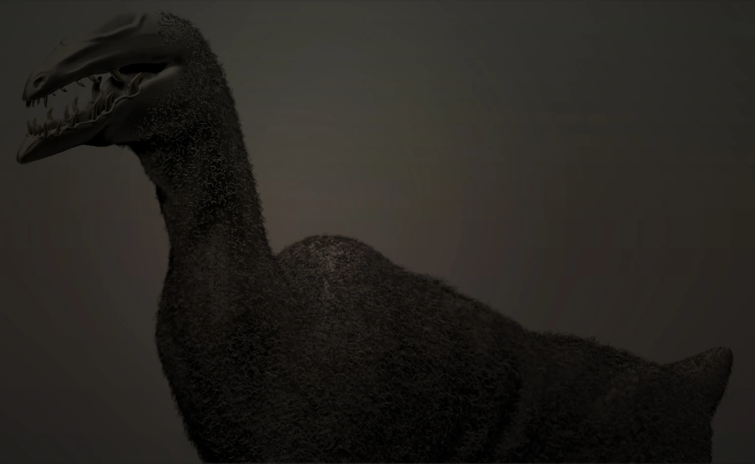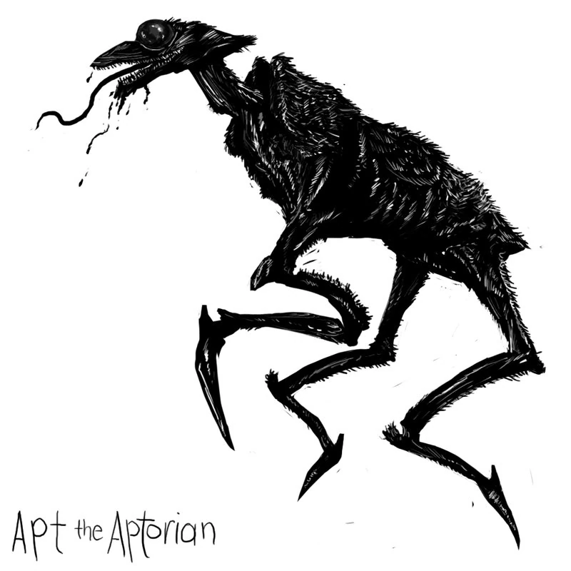Apt possessed one clawed long, multi-jointed foreleg which jutted out from a straggly split chest and two thin hindlegs. The Aptorian was around nine feet tall, with a flat elongated head, a long snout with slitted nostrils, swept back jawline, a long sinuous neck, hunched, angular shoulder blades and a body which was black all over apart from the torso, which was dun-grey. Much of the body was covered with thick, spiny bristles of hair. The demon's natural expression was a grin like a dolphin, exposing needle-sharp fangs. Although Apt only had one slate-grey/black multi-faceted eye, it seemed to observe with "appalling awareness".[2][3][4][5][6]