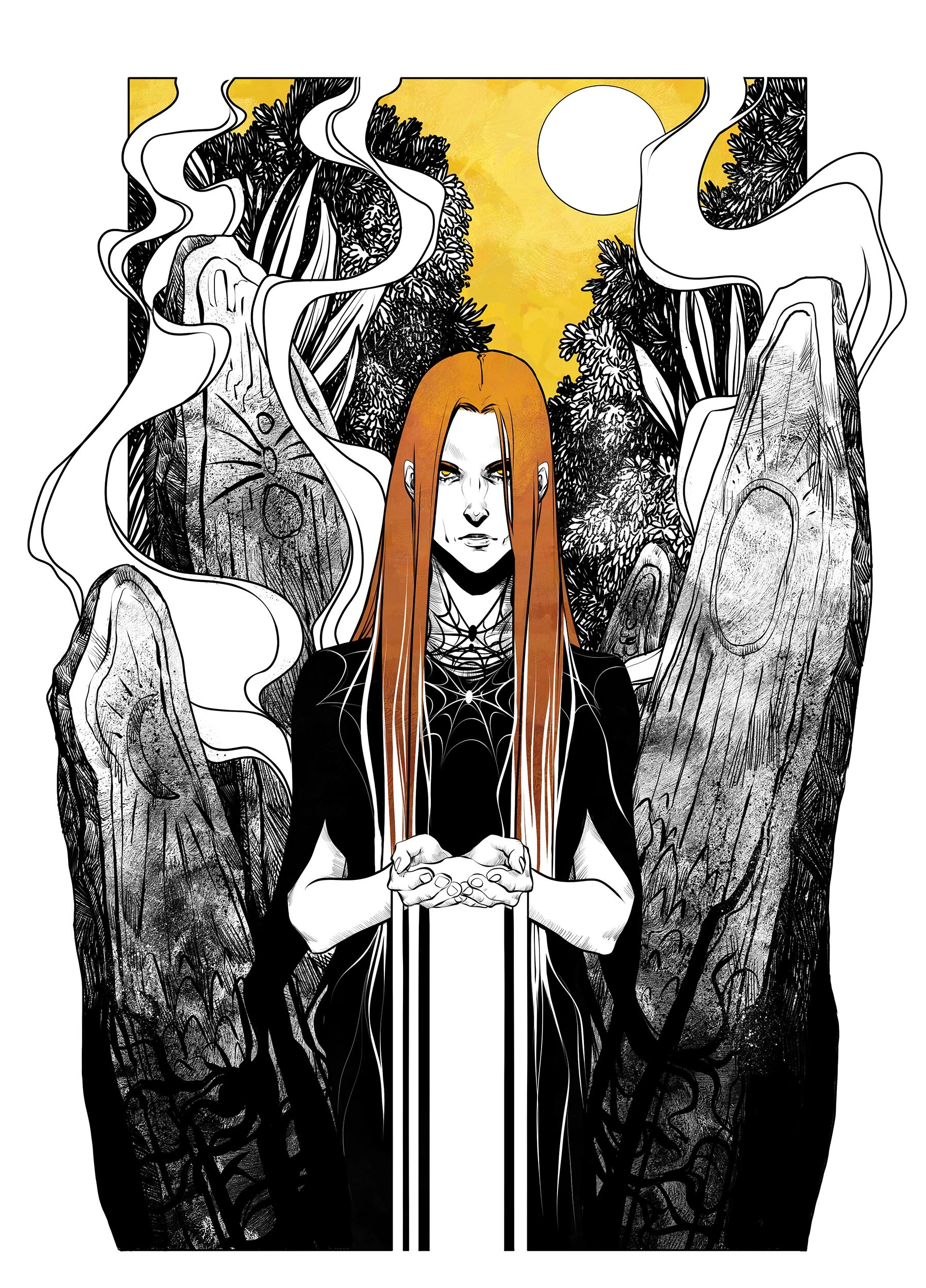 The ritual put Mappo into a dreamlike state in which he saw himself in a place he did not recognise. Tall stone pillars seemed to surround him in a pattern and their shadows formed a kind of web with him in the centre. A young woman appeared, dressed in black flowing silks with long hair the colours of dying flames, eyes the hue of beaten gold, unblemished skin and smooth hands. She told him that the place was Jacuruku and that the time was four or five years after The Fall (presumably that of the Crippled God). She remarked upon her own appearance, noting herself to be young again. Asked about her identity she answered: "A queen about to be driven from her throne, banished from her empire. My vanity is about to suffer an ignominious defeat." Mappo deduced her identity and offered to name her, but she told him that it would not be wise to do so.[4]