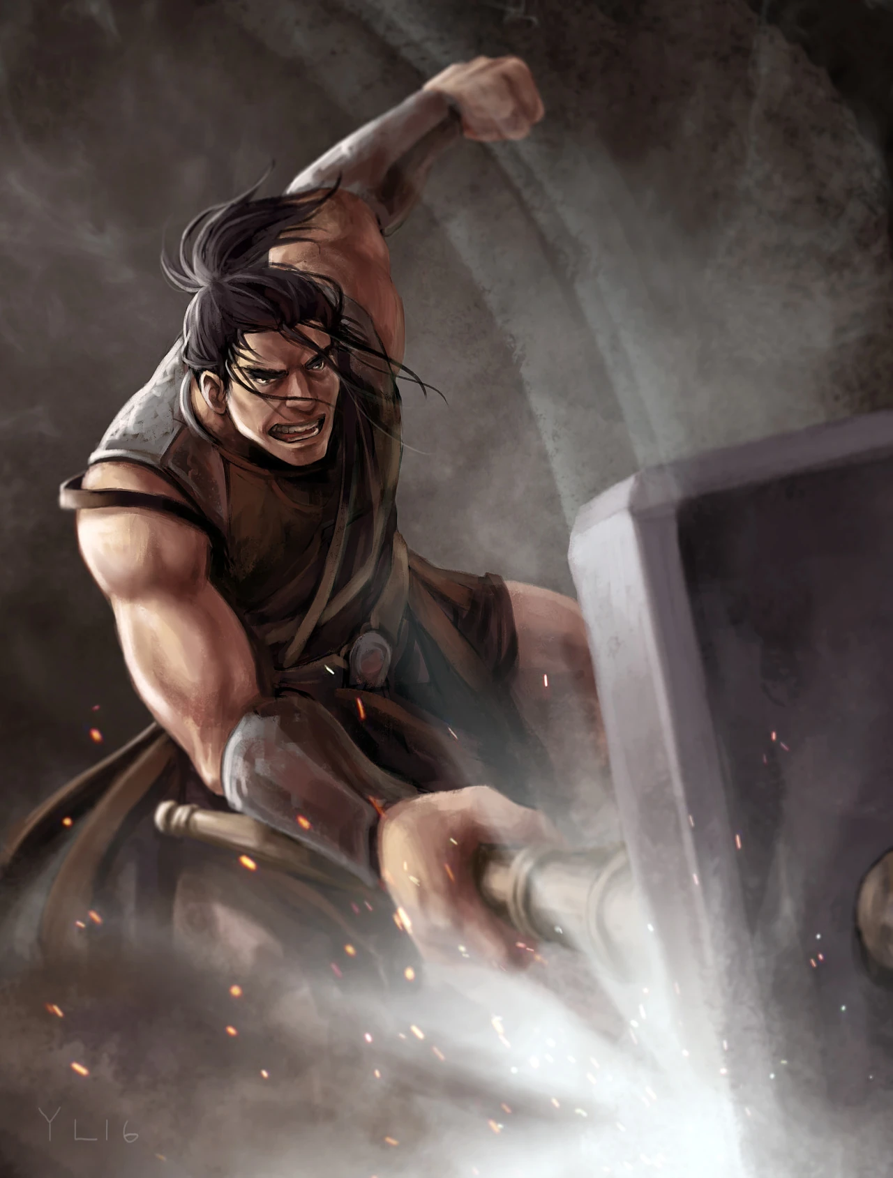 Many thousands of years ago, Brood, Rake, and the Queen of Dreams had walked the land together until Brood chose a more solitary path.[9] When he returned about 1200 years before the Malazan Book of the Fallen, he carried Burn's Hammer,[9] an enormous weapon of iron[10] with a copper-wrapped handle.[11] It was said to be capable of shattering mountains, with the Great Raven, Crone, presenting the broken peaks east of the Laederon Plateau as evidence of Brood's "younger, more precipitous days".[12]