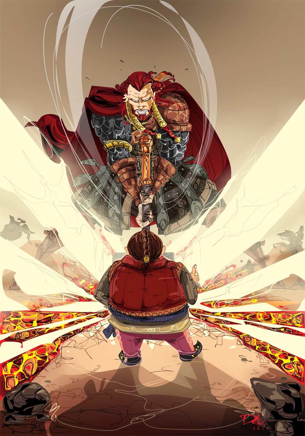 In the end, Kallor betrayed the alliance, killing Whiskeyjack and severely wounding Korlat before joining the Crippled God. Orfantal brought Brood to the battlefield by Warren so that the warlord could heal his sister.[34][35] Thinking Rake and Moon's Spawn destroyed and faced with an overwhelming number of the Seer's undead K'ell Hunters, Brood felt no choice but to draw his hammer.[36] But he froze with his hammer held high as the newly freed god, Togg, howled and summoned thousands of T'lan Ay to their defence followed by the arrival of Rake and his Skykeep.[37]