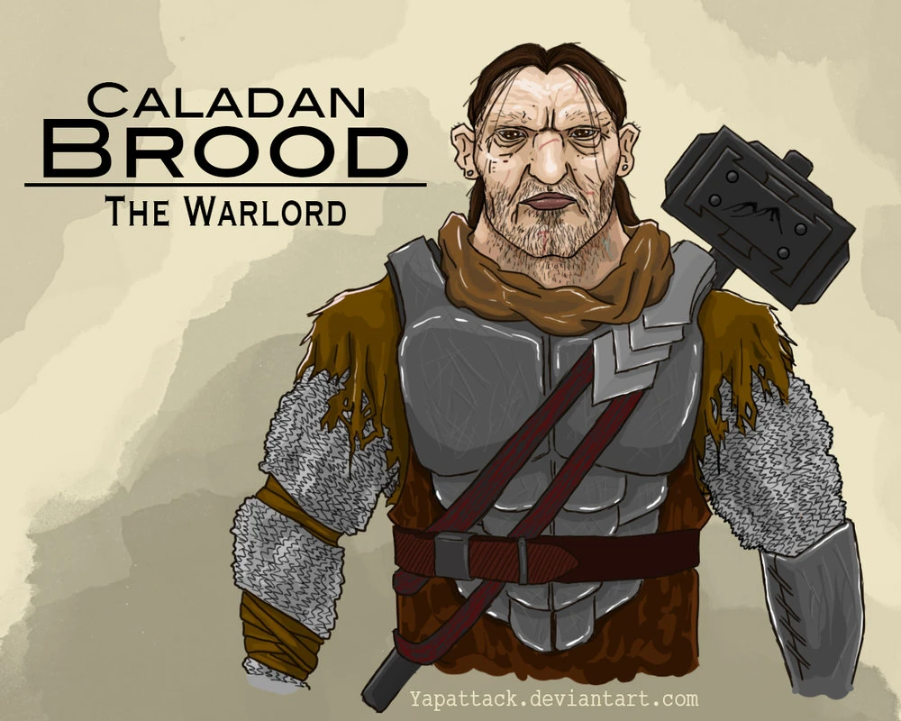 Caladan Brood was a warlord, often called simply the Warlord,[1] who opposed the Malazan armies in the North Campaign on Genabackis.[2] He was a giant man, all muscle and bone, and was said to be human with Barghast blood.[3] Said to be an Ascendant,[4] power rolled from him in musky waves. His eyebrows were hairless and his teeth were filed.[5] He had a wide, flat face with strangely bestial eyes.[6][7]
