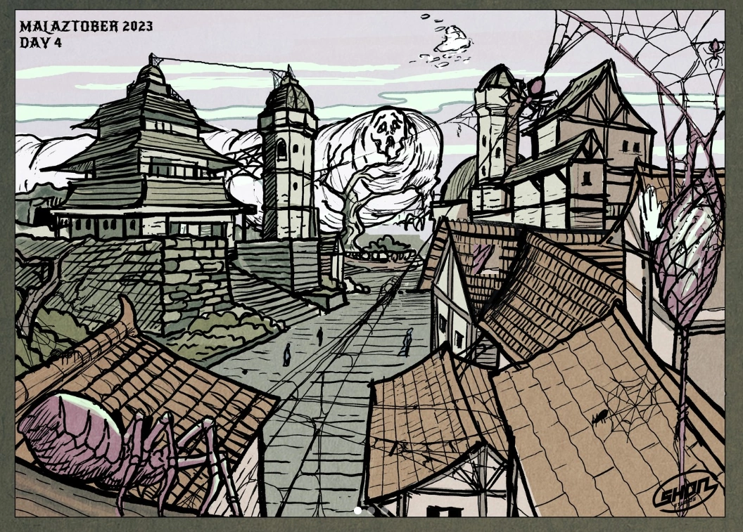 The Grand Temple of D'rek was the largest structure in the city, but was left in a state of disrepair.[14] The other temples fared little better and the ornate architecture of the Septarch District's decrepit towers and domes was festooned with paralt webbing and chitinous rubbish.[17]