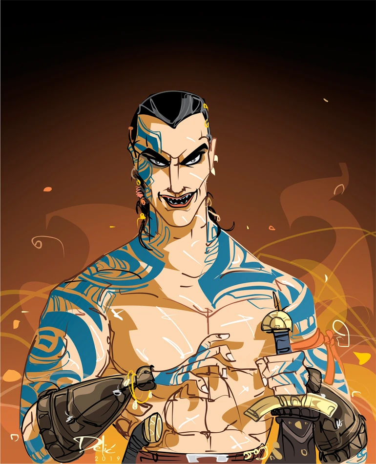He was a savage and brutal fighter equally adept with throwing axes as well as the longsword. His protective fetishes and tattoos made him fearless in the face of sorcery.[11] He often defaulted to an unnerving, sharp-toothed grin when suspicious,[12] and chanted in the thick of battle.[13]