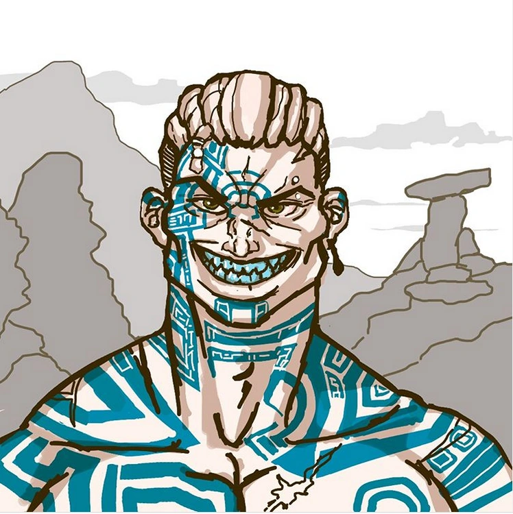 Trotts was described as burly,[6] a wide-shouldered man with black hair, braided into a ponytail and knotted with charms and fetishes. His arms were covered in blue woad tattooing, the spiral patterns interrupted every now and then by white scars. He had coal dark eyes, blue-stained filed teeth, a thin, wide mouth, and would use a monotone voice when counting in a card game.[7][8][9][10]
